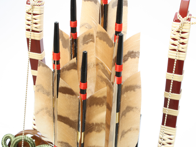 初正月では弓、矢を組み合わるのが一般的です。すべて天然の羽根を使用しています。