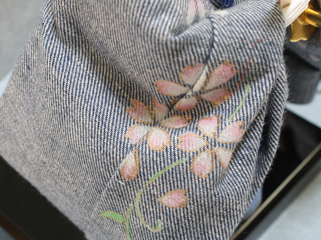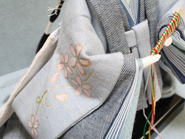 デニム生地に京都伝統手法である京友禅染めを施すという世界でも唯一無二の技術を使い好光オリジナルで作って頂いた生地になります。この生地を使い好光が雛人形を製造する事で、デニムの重厚感ある質感にお袖に見えます桜の染め物が美しい好光人形だけの親王飾りが誕生致しました。
