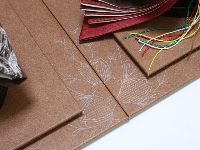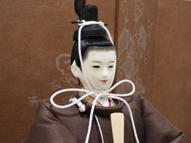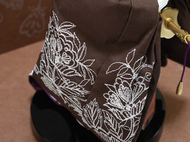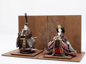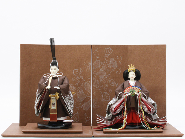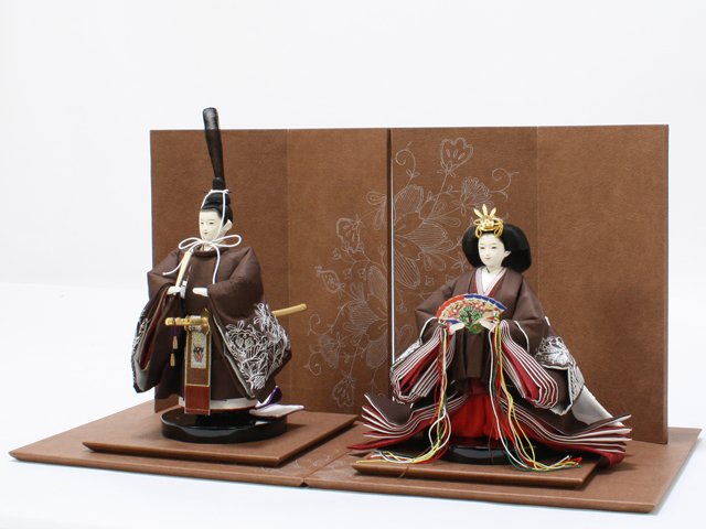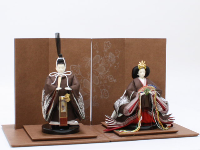 地の茶色は正絹を使用する事で光沢ある滑らかな質感になっております。 台屛風の唐花は手書きで一枚一枚書き起こしたものになります。飾り全体を茶色に統一し、唐花のアクセントをより強調させる雛飾りです。