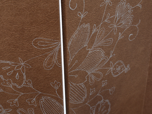 艶のある茶色ベースの生地に白糸で唐花が刺繡されております。細い線で繊細なデザインの刺繡が特徴的なお着物です。