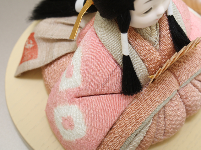 「一枚一枚生地を胴体に着せて作ります。重ねた衣裳の色合いが美しい華やかな雛人形です。