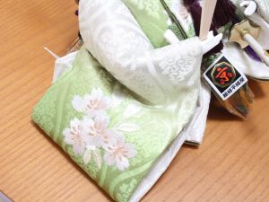 雛人形|ひな人形|初節句|コンパクト|おしゃれ|モダン|インテリア|プレミアム|こだわり|おすすめ|作家|《商品名》衣装着親王飾り 収納 京十二番 西陣袋帯〔商品コード〕32212-0242 〔品番〕T6-12-2 ◆台屏風 33320-0118 桜色 掛軸 桜橘